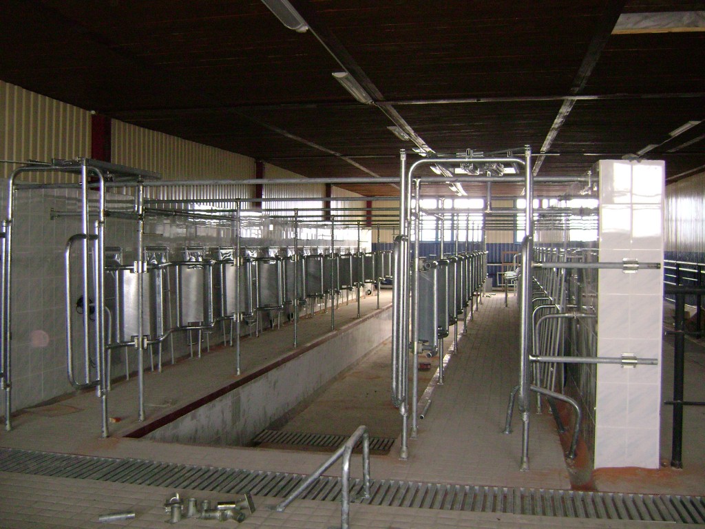 The machines are located parallel on both sides of the trench. Each machine accommodates 10 cows at an angle of 30 ° to the working trench.