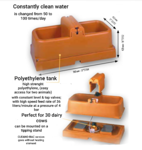Современные обогреваемые поилки Isobac (Франция) имеют двойные полиэтиленовые стены с термической между ними изоляцией. Нижняя часть полностью тепло изолированная. Две больших чаши обеспечивают постоянный доступ к воде с постоянным ее уровнем: 34 л/мин при 4 бар. Низкий уровень воды и большой объем проточной воды предотвращают осаждения органических веществ на дне чаши и развития бактериальных культур, которые ускоряют возникновение мастита и поноса у телят.
